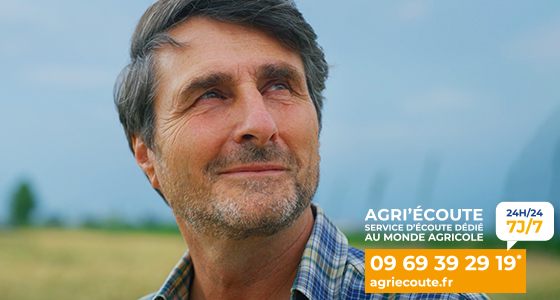 Mal-être, solitude, dépression, difficultés personnelles ou professionnelles... Ne restez pas seul face aux difficultés, parlez-en avec un professionnel 24H/24 par téléphone au 09 69 39 29 19 (prix d'un appel local) ou par tchat sur agriecoute.fr.